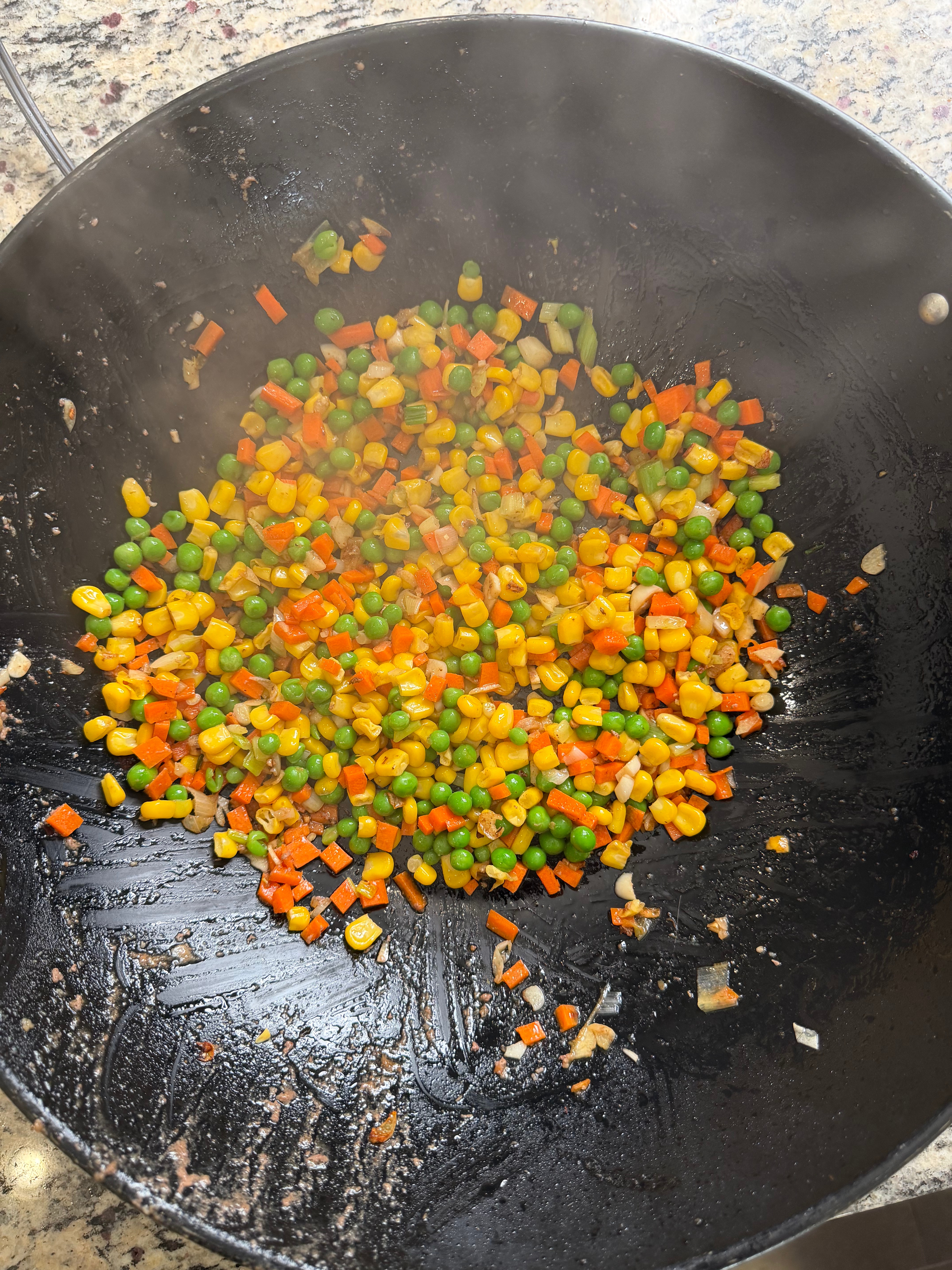Now, add a little more oil to the wok if you need it and sauté your chopped garlic and green onions until they are fragrant. Toss in the carrots, peas, and corn, and give them a good stir-fry until they are bright and tender. Push the veggies to the side of the wok and crack your eggs into the center. Scramble them quickly right there in the pan, then mix them in with the vegetables.