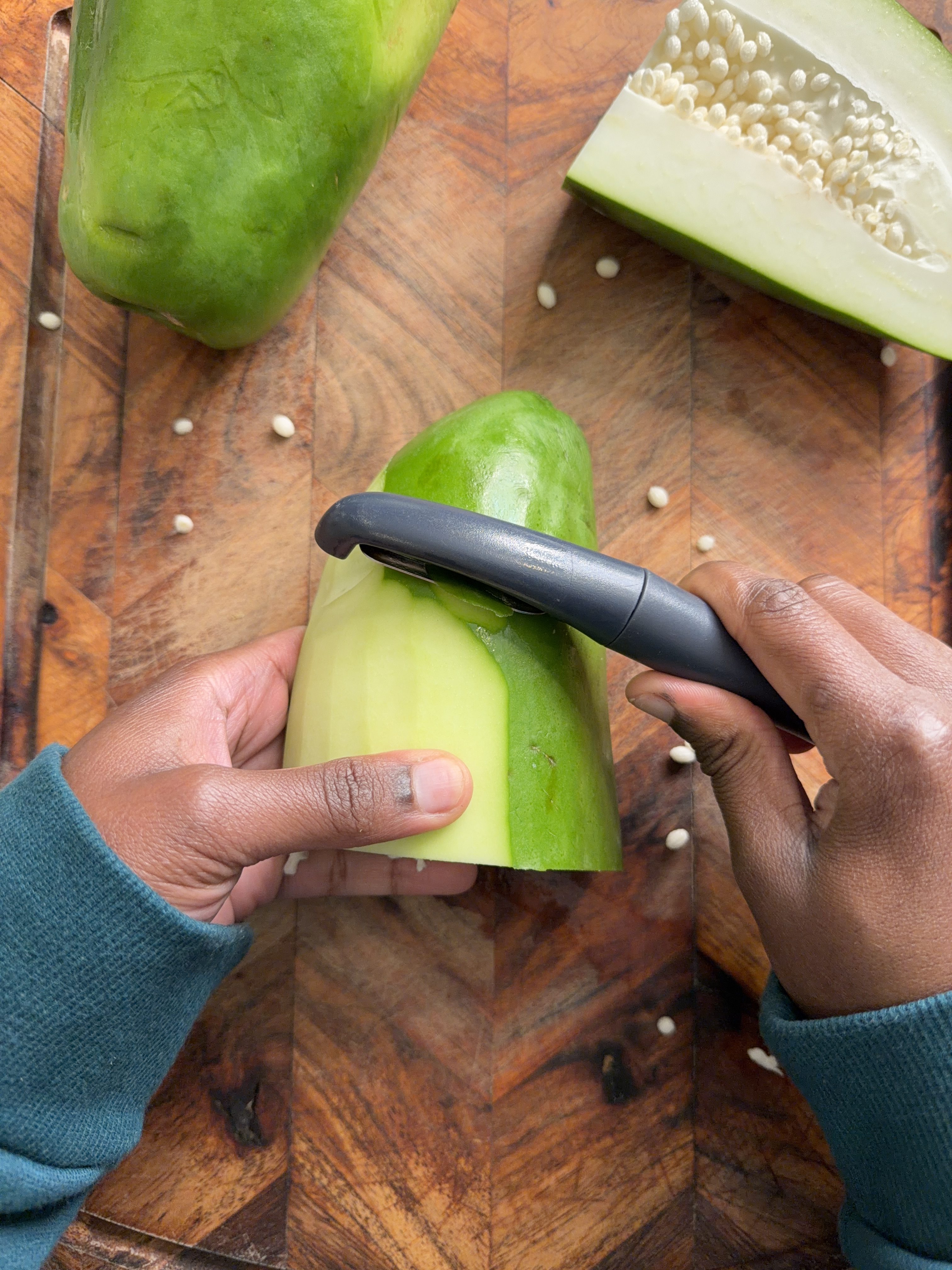 Peel and deseed the papaya, then shred it. Sprinkle with salt and let sit for 15 minutes. Place the papaya in cheesecloth and squeeze out excess moisture.