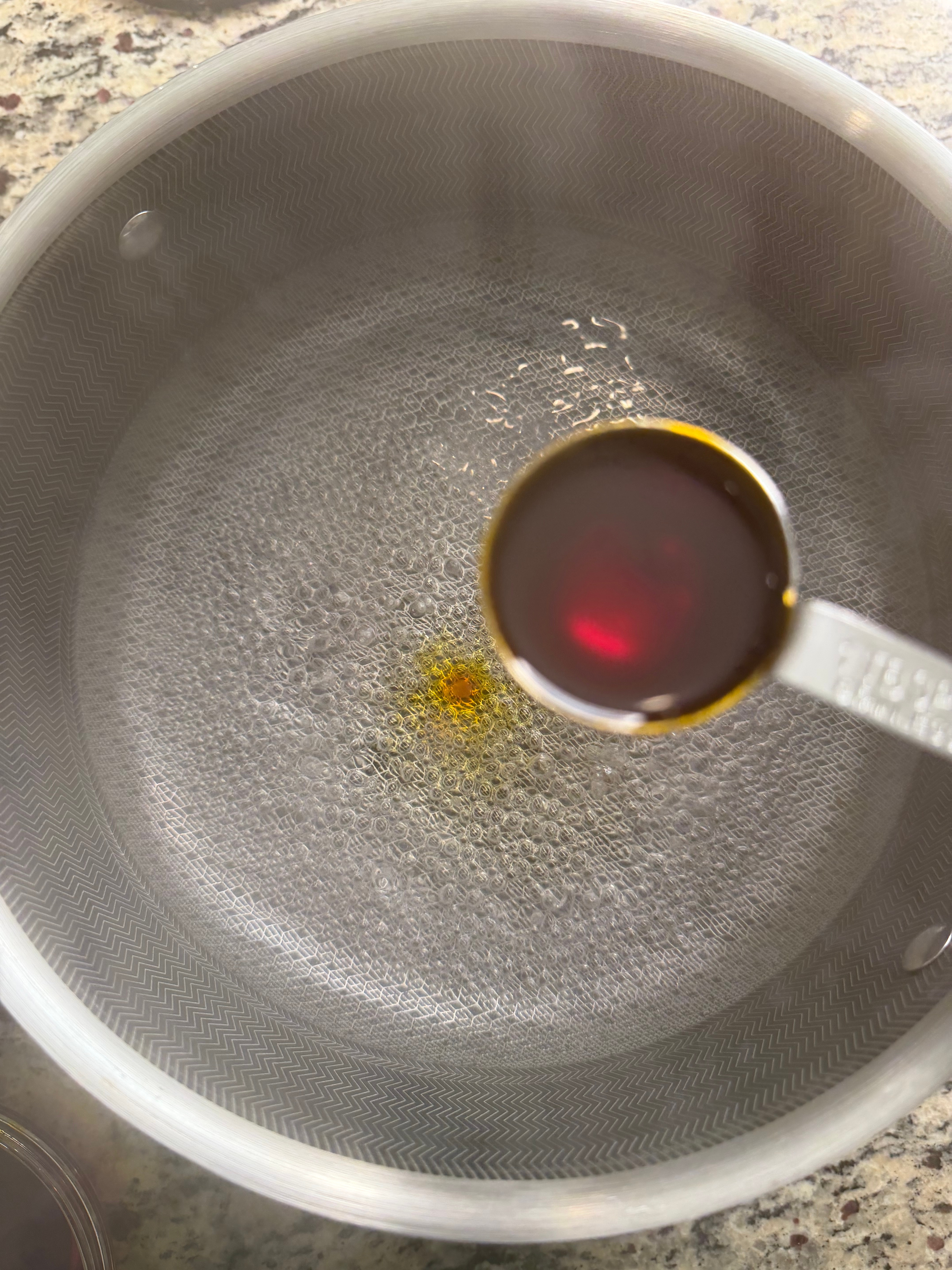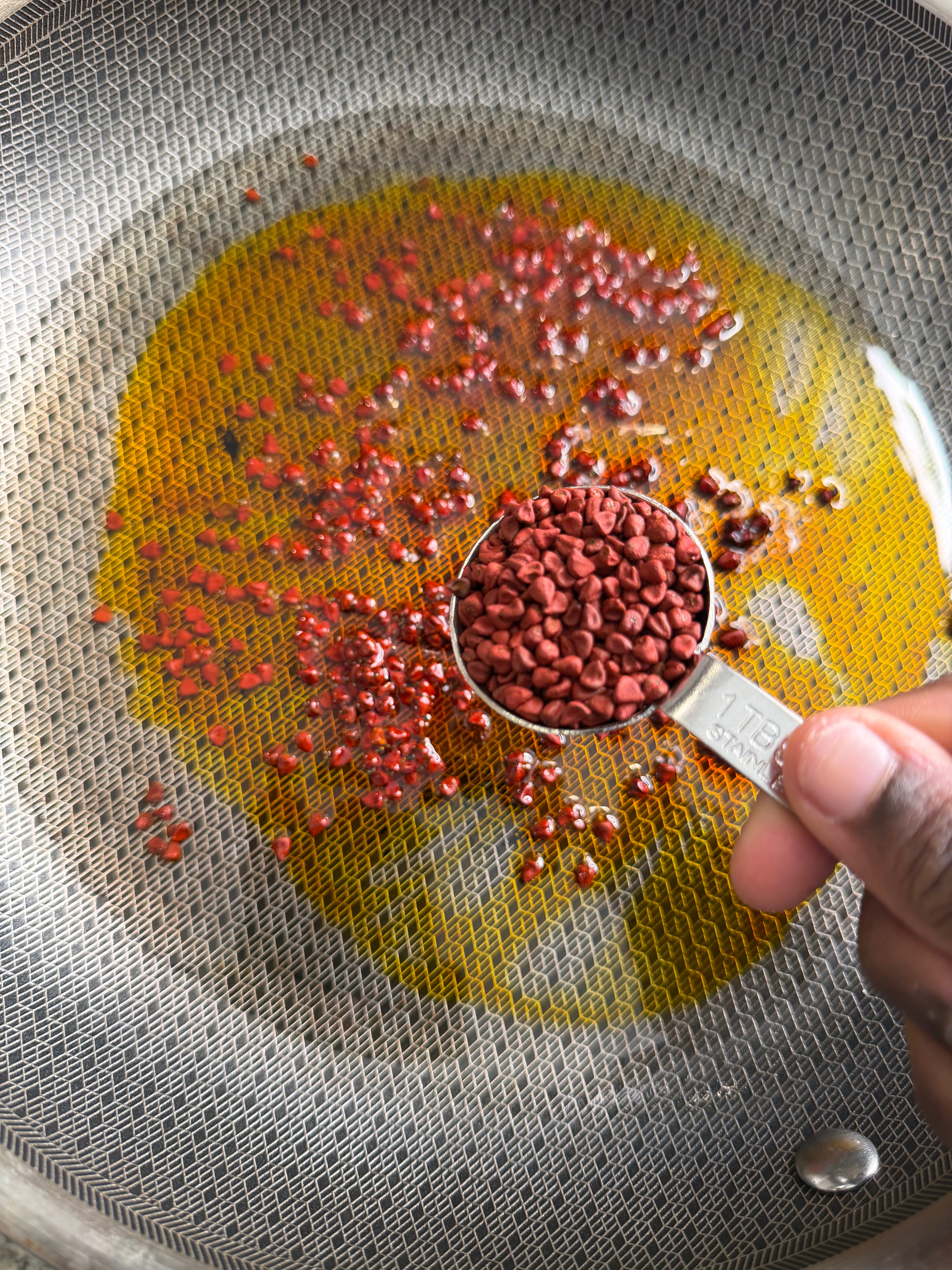 Next, make the annatto oil. In a pan, heat 6 tablespoons of oil and add 2 tablespoons of annatto seeds. Cook until the oil becomes fragrant and the color begins to bleed into the oil. Remove from heat and strain out the seeds. If you’re using annatto powder, you can skip this step and simply mix 1–2 tablespoons into the boiling water along with 4 tablespoons of oil when making the dough.