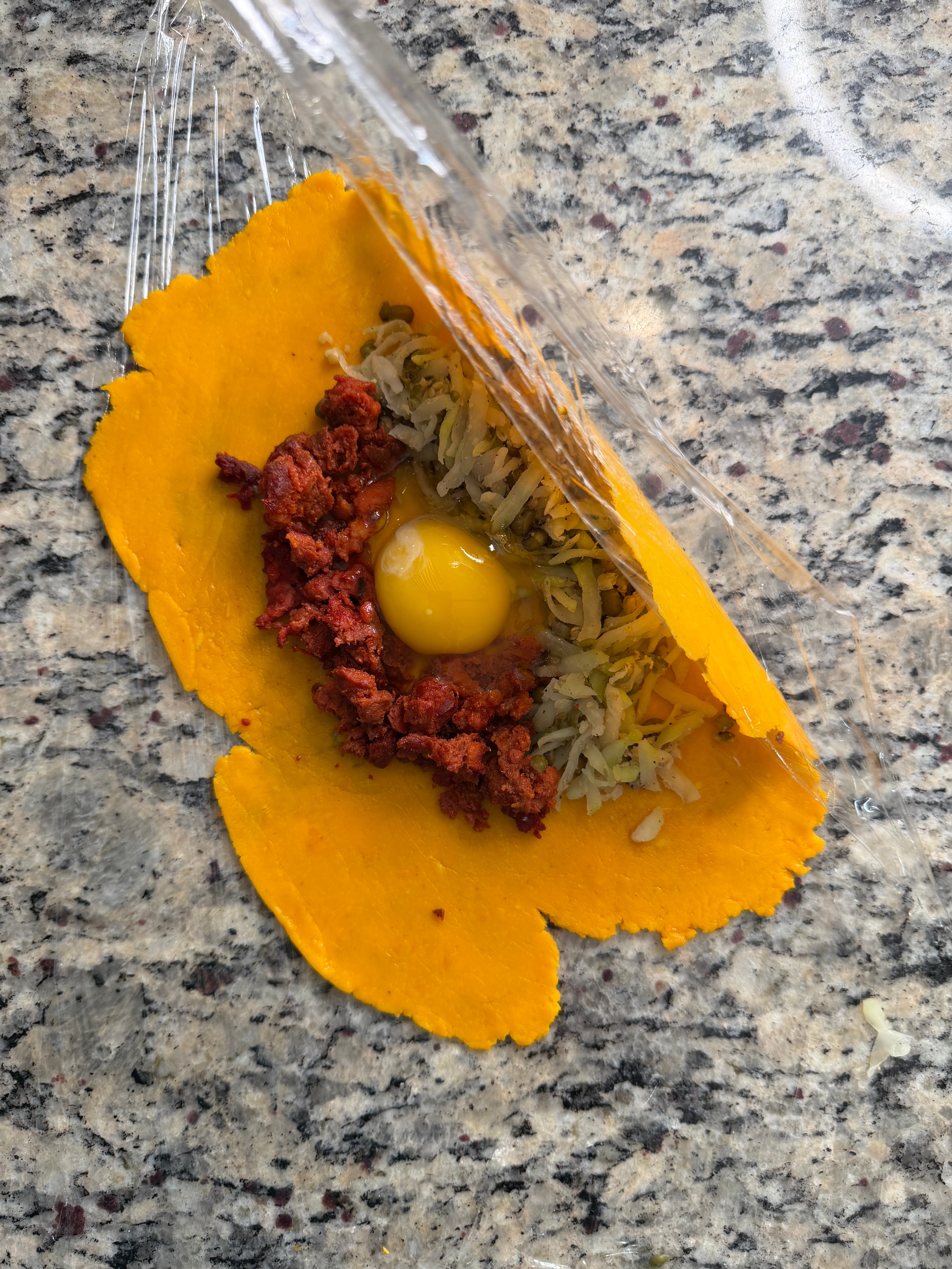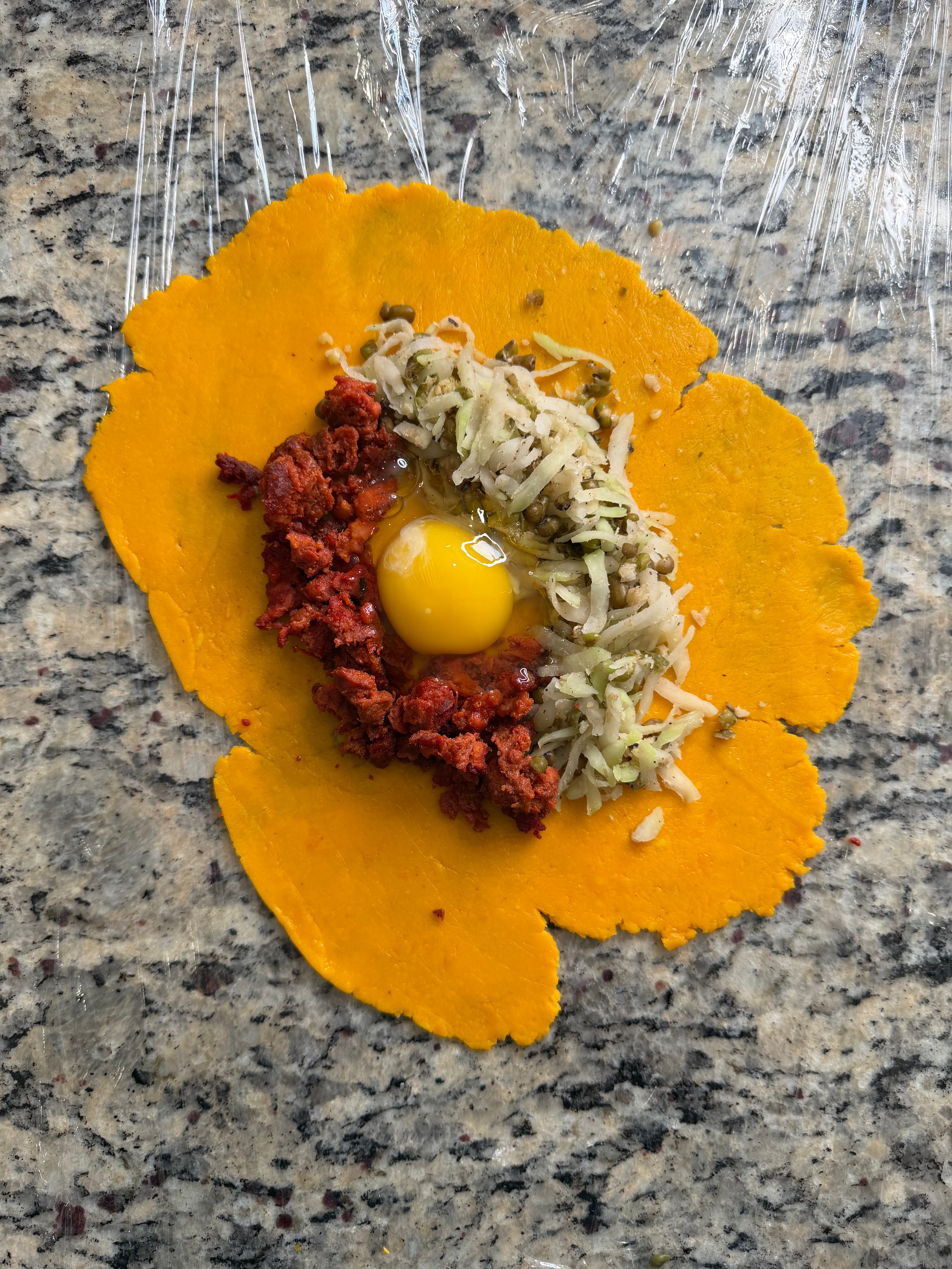 Add your filling: papaya and mung bean mixture, cooked longganisa, and crack the egg in the center.