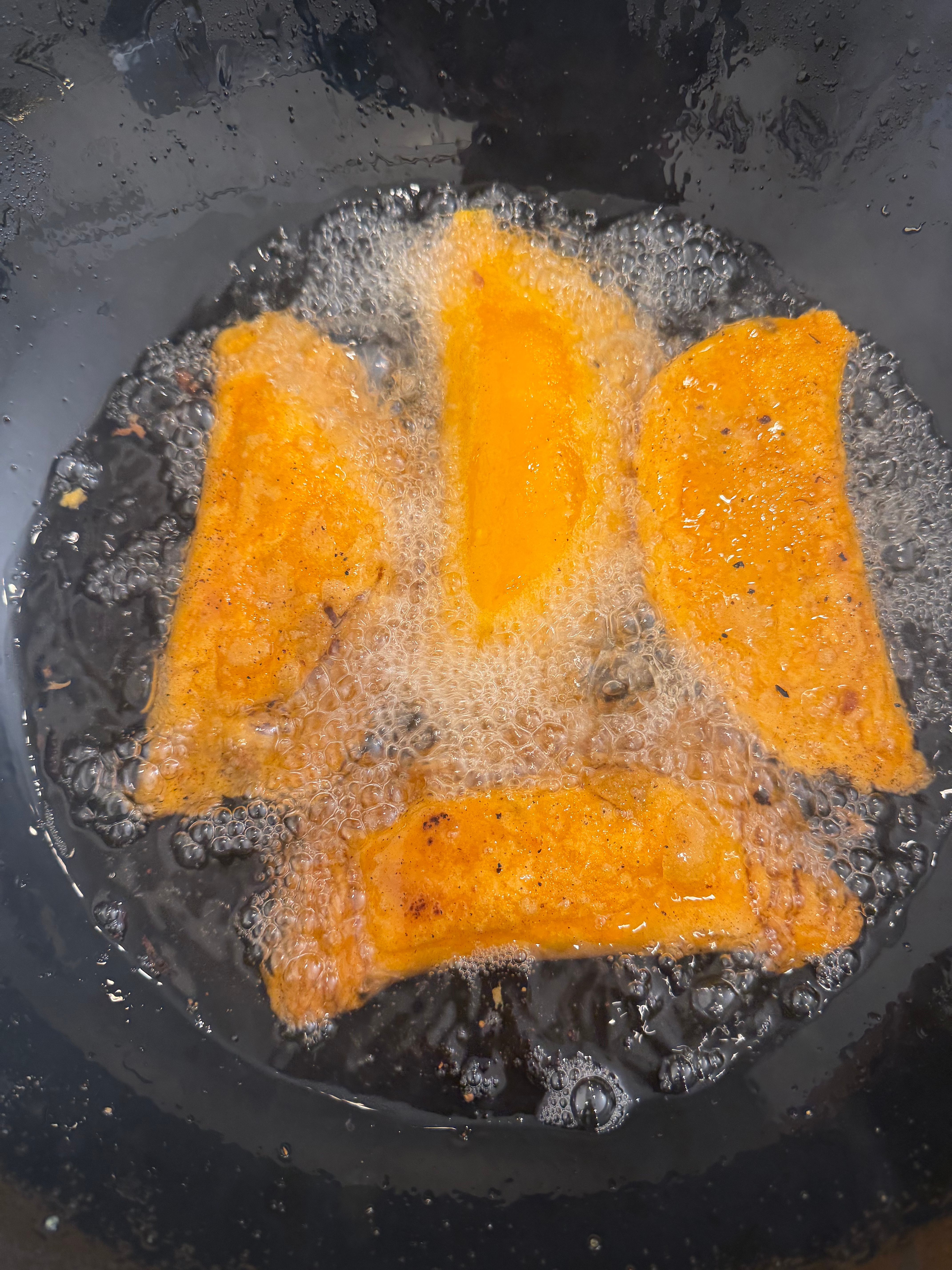 Heat oil to 350–375°F and deep fry the empanadas until crispy and deep orange in color.